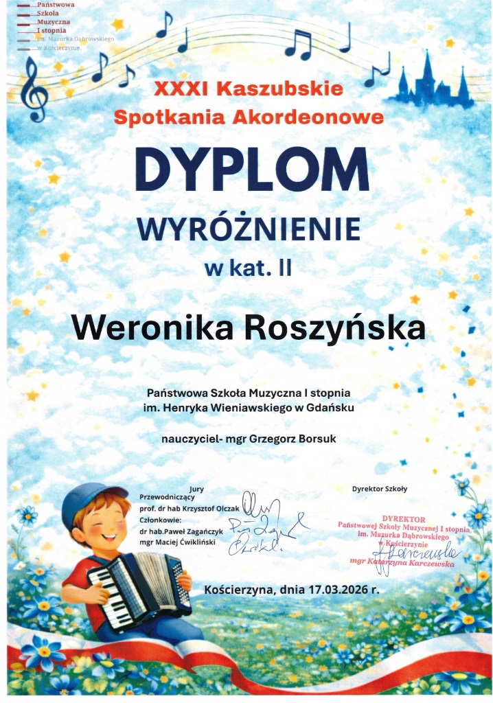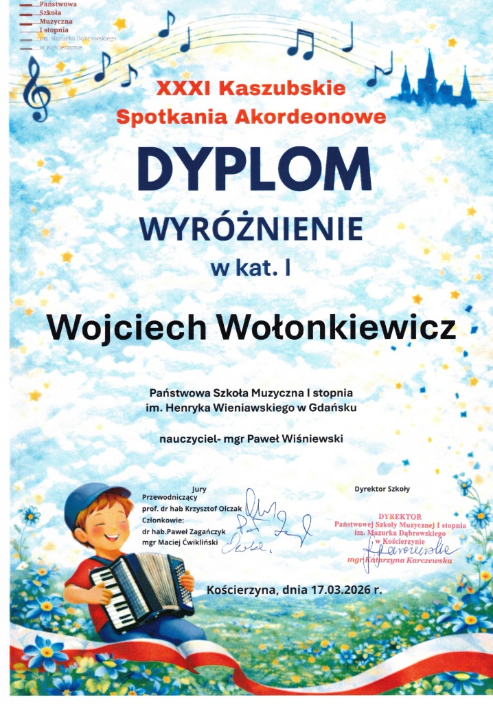 Podczas XXXI Kaszubskich Spotkaniach Akordeonowych w Kościerzynie w dniu 17 marca 2026 nasi akordeoniści Wojciech Wołonkiewicz z klasy 2 cyklu 6-letniego pana Pawła Wiśniewskiego oraz Weronika Roszyńska z klasy 3 cyklu 6-letniego i Antonina Kosmala z klasy 3 cyklu 4-letniego pana Grzegorza Borsuka otrzymali wyróżnienie. Serdecznie gratulujemy i życzymy dalszych sukcesów.
