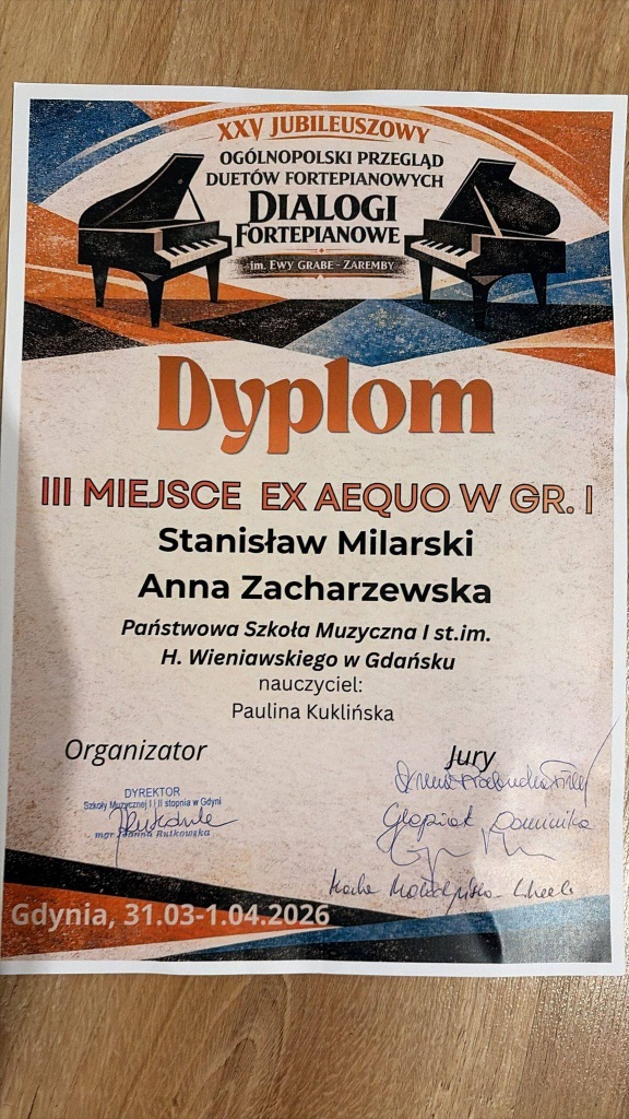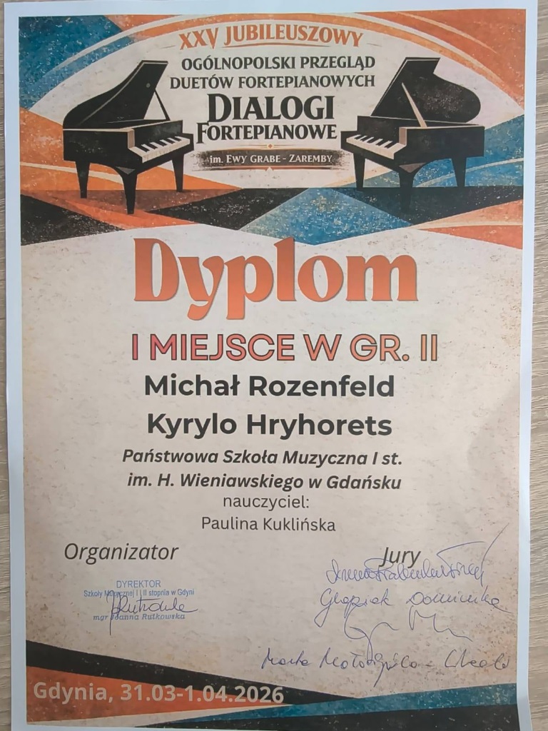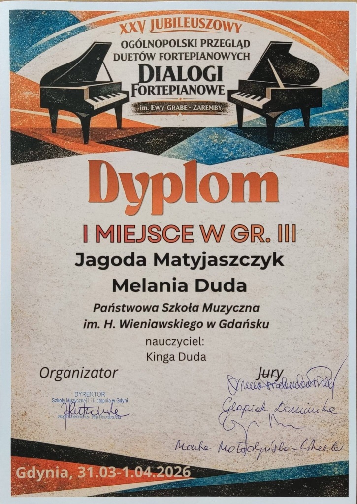 31 marca b.r. trzy zespoły fortepianowe reprezentowały naszą szkołę podczas Ogólnopolskiego Przeglądu Duetów Fortepianowych "Dialogi Fortepianowe" im. Ewy Grabe-Zaremby w Gdyni.