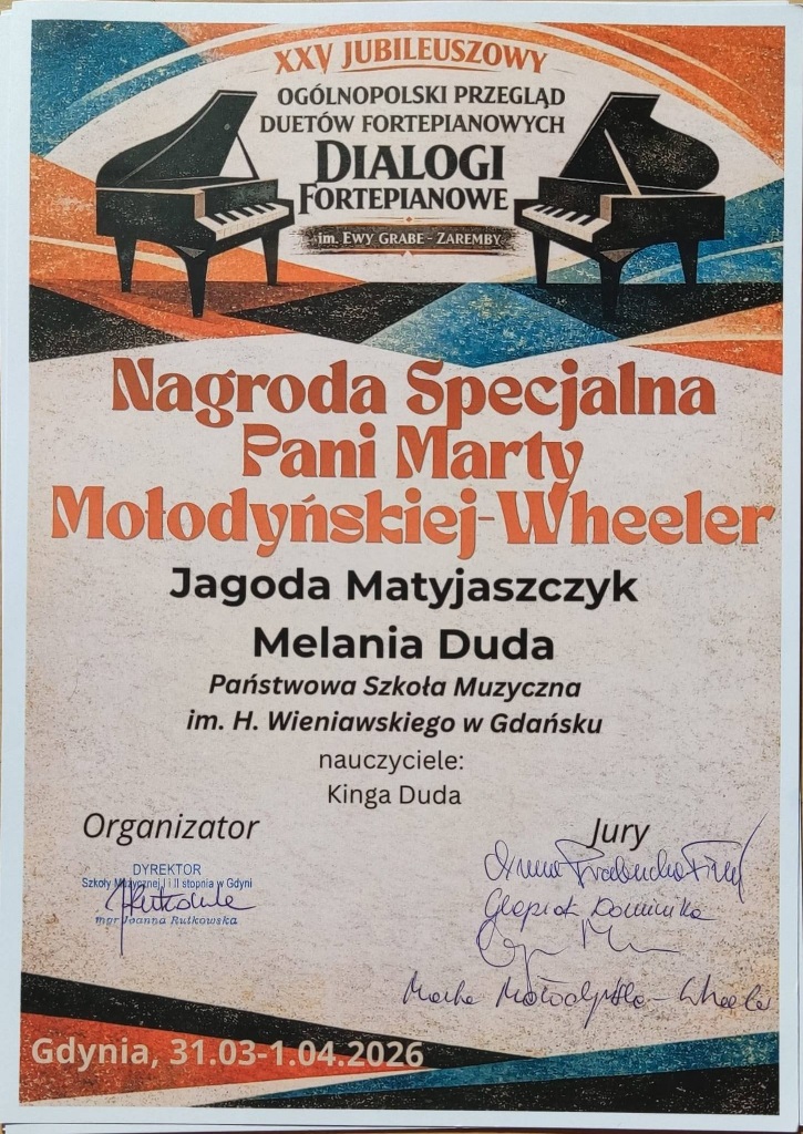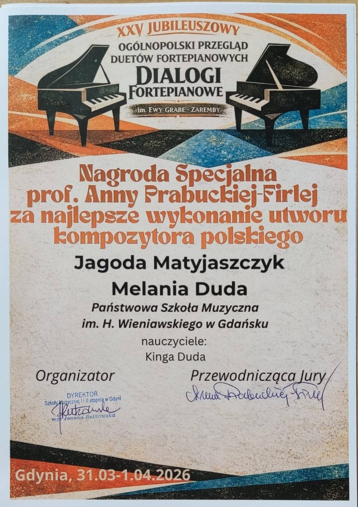 Jury przyznało również dodatkowe nagrody: Nagrodę Specjalną prof. Anny Prabuckiej- Firlej (Przewodnicząca Jury) za najlepsze wykonanie utworu kompozytora polskiego oraz Nagrodę Specjalną znakomitej polskiej Kompozytorki Pani Marty Mołodyńskiej-Wheeler. Obie te nagrody otrzymał duet Jagoda Matyjaszczyk-Melania Duda.