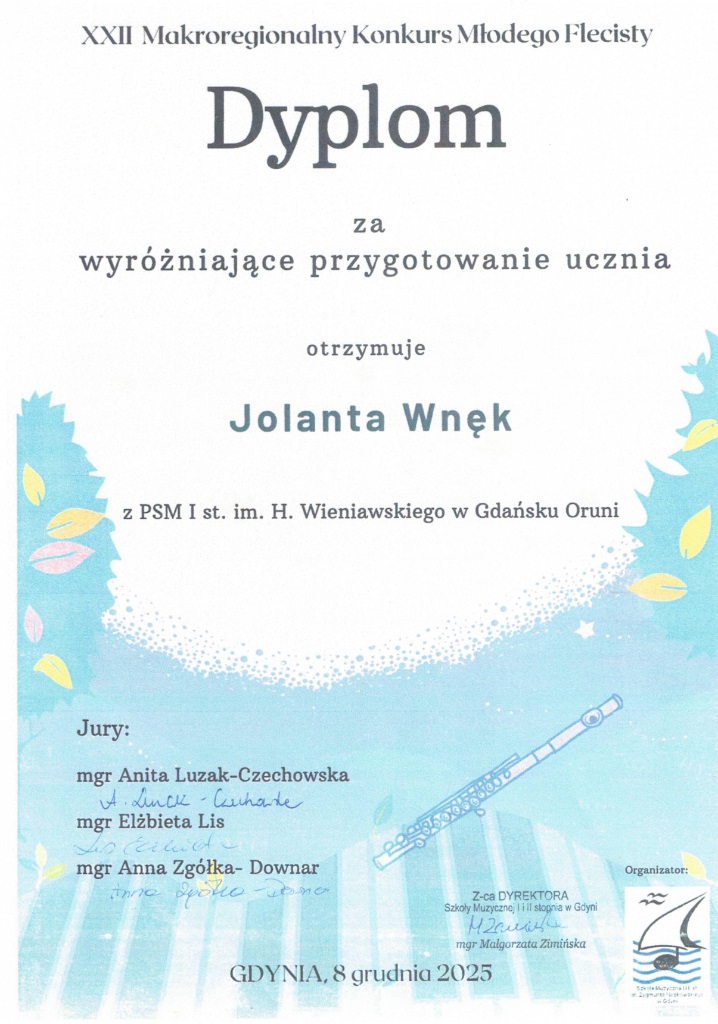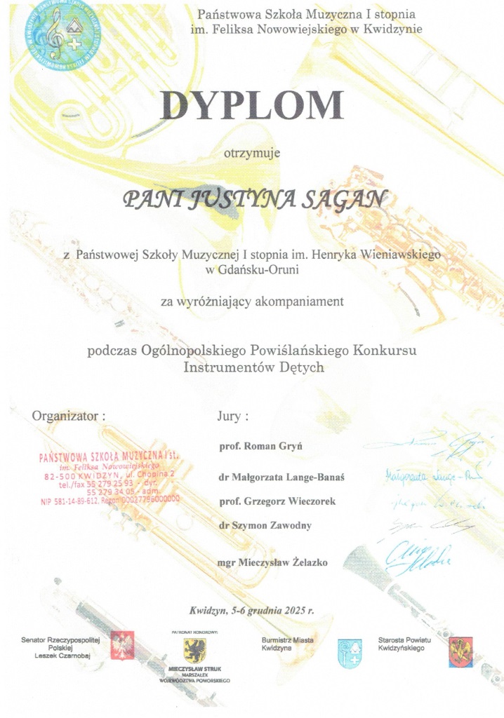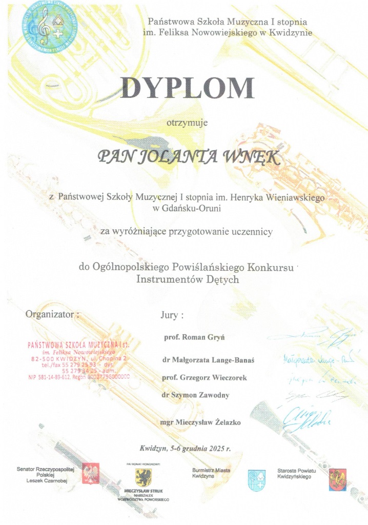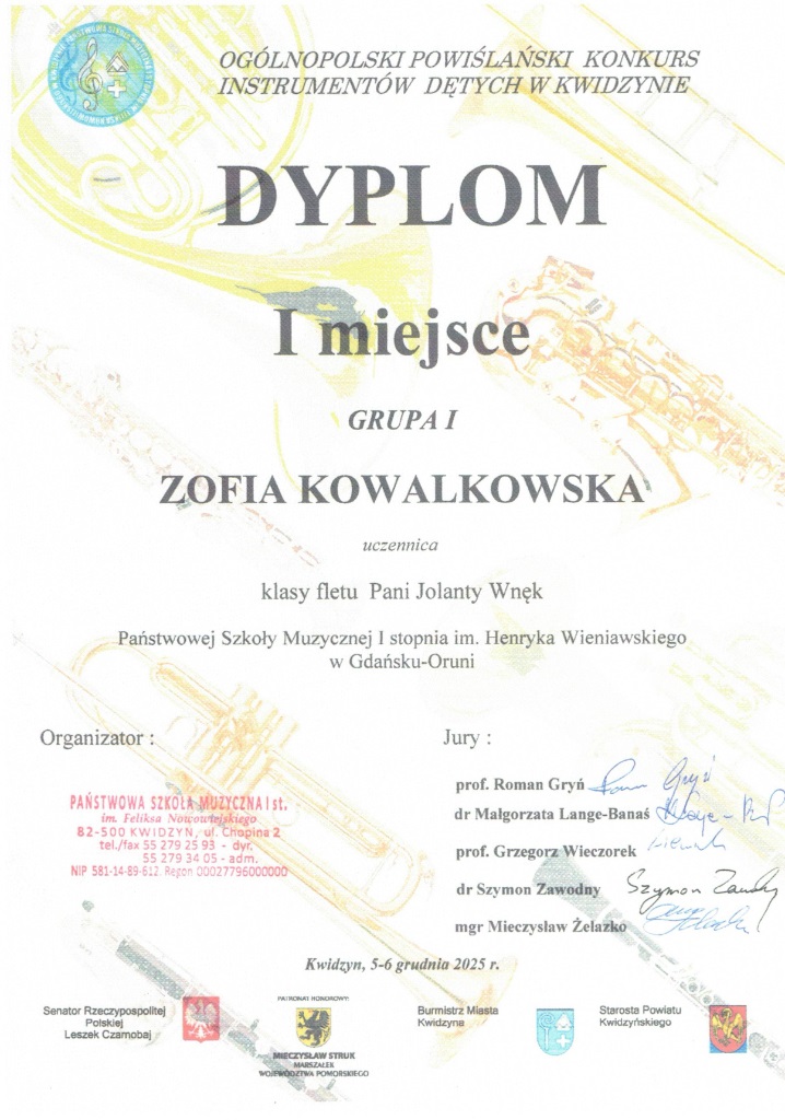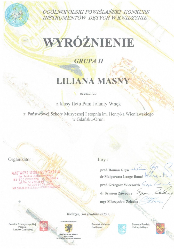 W dniach 5-6 grudnia 2025 w Kwidzynie odbył się Ogólnopolski Powiślański Konkurs Instrumentów Dętych. Uczennica z klasy fletu p. Jolanty Wnęk Zofia Kowalkowska zajęła pierwsze miejsce a Liliana Masny również z klasy p. Jolanty Wnęk wyrożnienie.