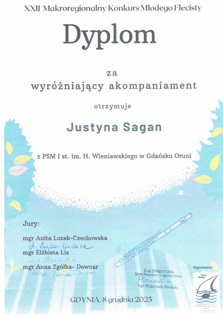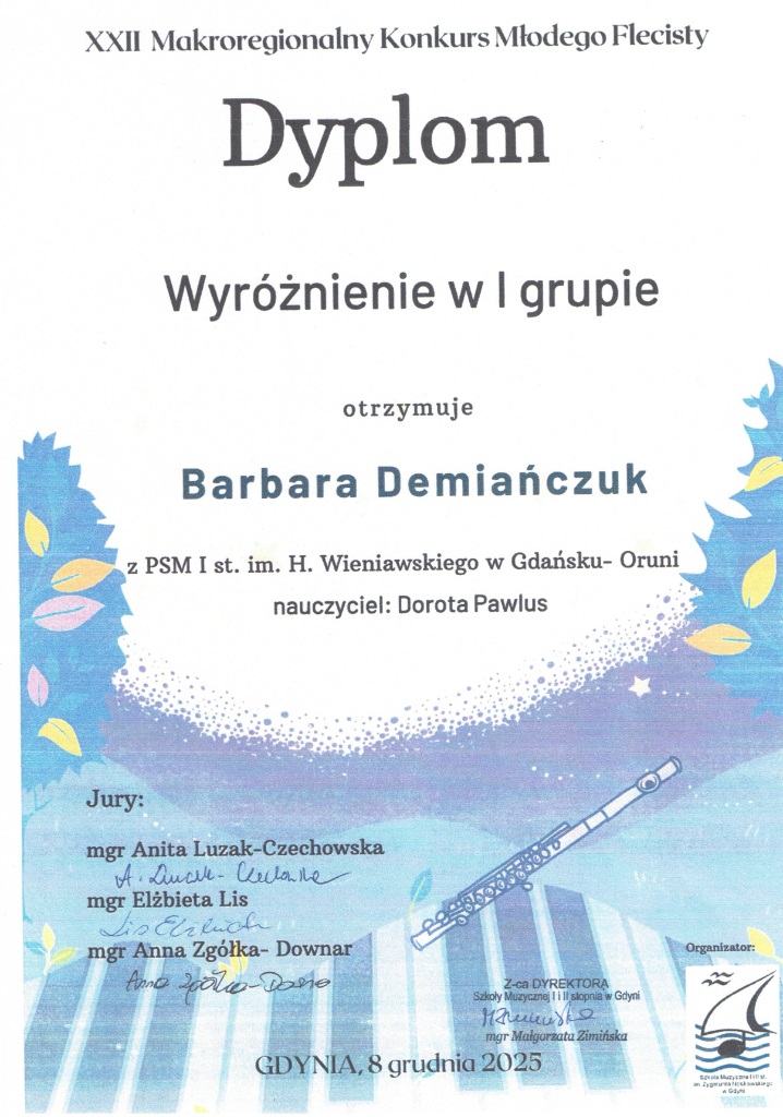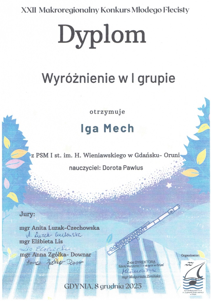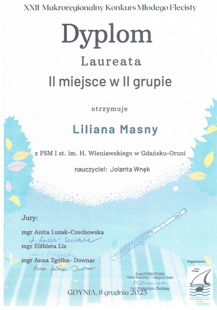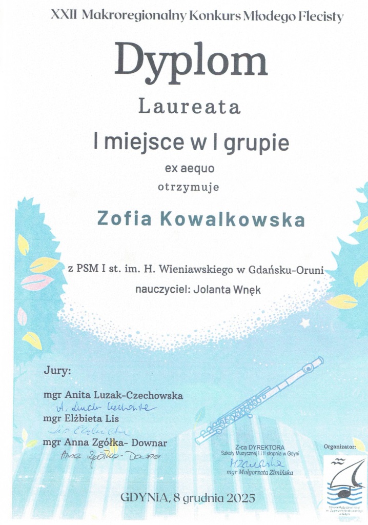 W dniach 5-6 grudnia 2025 w Kwidzynie odbył się Ogólnopolski Powiślański Konkurs Instrumentów Dętych. Uczennica z klasy fletu p. Jolanty Wnęk Zofia Kowalkowska zajęła pierwsze miejsce a Liliana Masny również z klasy p. Jolanty Wnęk wyrożnienie.