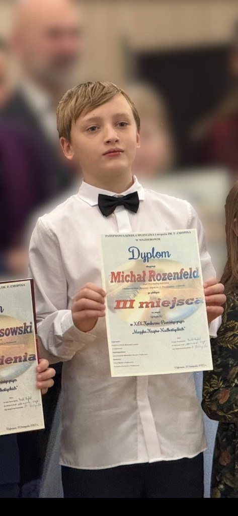 Michał Rozenfeld z klasy 4 fortepianu p. Pauliny Kuklińskiej otrzymał III miejsce na XIX Konkursie pianistycznym „Muzyka Krajów Nadbałtyckich” w Wejherowie, a 30 listopada w Akademii Muzycznej w Gdańsku reprezentował naszą szkołę w ramach koncertu z cyklu Młode Talenty w aMuz. Serdecznie gratulujemy i życzymy dalszych muzycznych sukcesów!